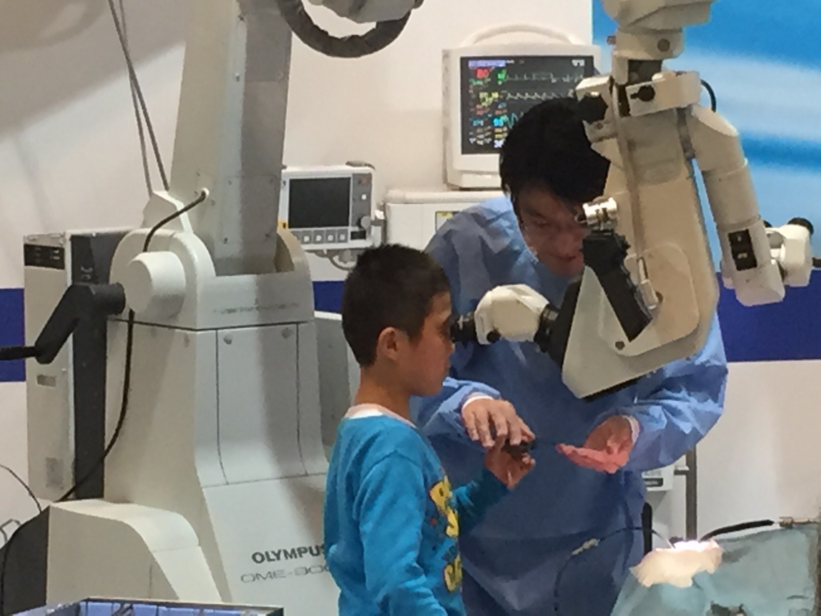 脳外科医とバーチャル内視鏡手術を体験する小学生